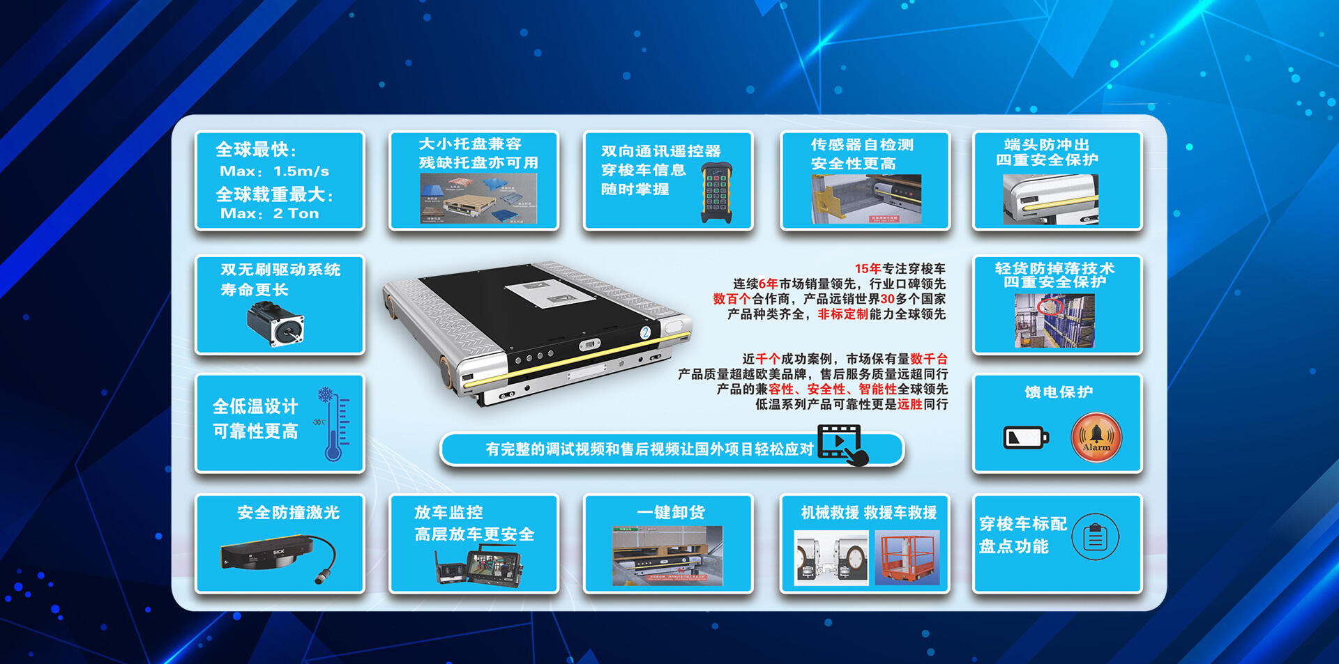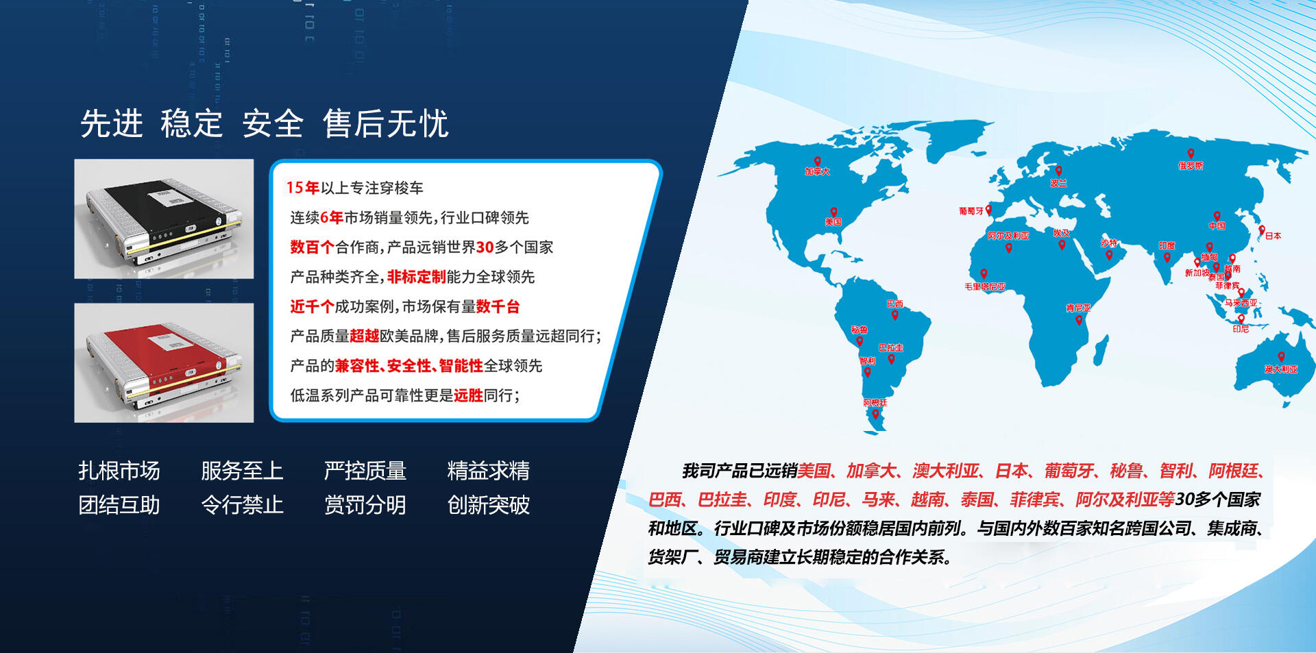 我司產品已遠銷美國、加拿大、澳大利亞、日本、葡萄牙、秘魯、智利、阿根廷、巴西、巴拉圭、印度、印尼、馬來、越南、泰國、菲律賓、阿爾及利亞等30多個國家和地區。行業口碑及市場份額穩居國內前列。與國內外數百家知名跨國公司、集成商、貨架廠、貿易商建立長期穩定的合作關系。累計數千臺穿梭車數百個成功案例,如:中石油、中石化、中糧、伊利、蒙牛、一頭牛、可口可樂、松下、東芝大王、牧田、益海嘉里、怡寶、東鵬、葵花、國藥、百靈、雙鶴、東方雨虹等。