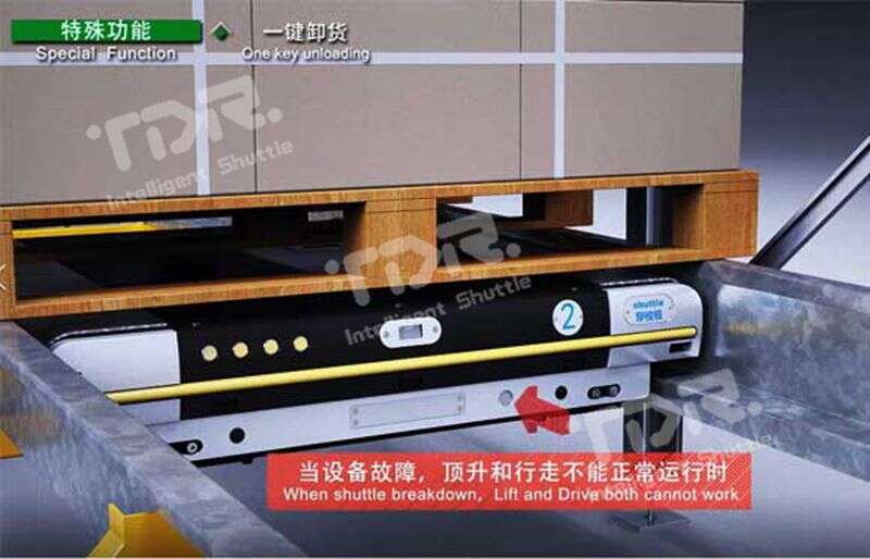 當使用救援車救援穿梭板時,如穿梭板出于重載狀態,則很難將穿梭板帶貨物一起拖出,通過此功能,一鍵即可將托盤放置到軌道上,直接將穿梭板拉出即可!