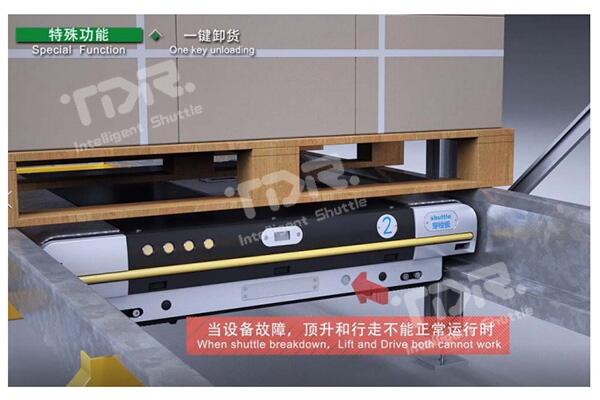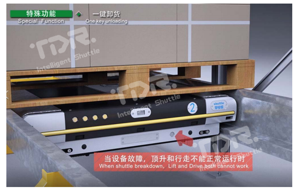 當使用救援車救援穿梭板時,如穿梭板處于重載狀態,則很難將穿梭板帶貨物一起拖出,通過此功能,一鍵即可將托盤放置到軌道上,直接將穿梭板拉出即可。